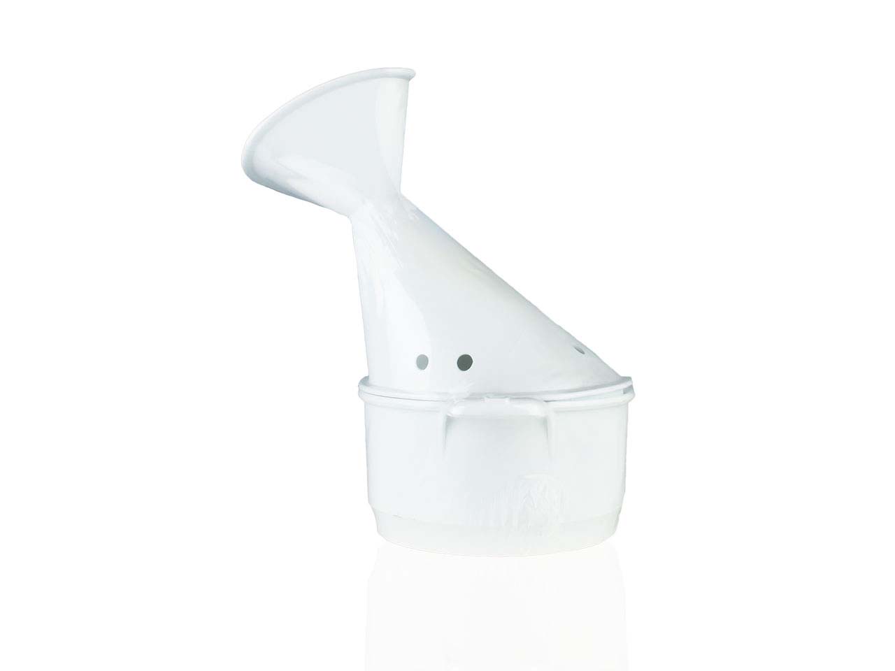 Plaats de onderkant van de stoombeker op een vlakke ondergrond op eettafel hoogte. Vul deze met heet water (van de kook af, max 90 °C). Plaats het bovenste deel (tuit) op het onderste deel en draai (met de klok mee) totdat de lipjes vastklikken. Voeg desgewenst een eetlepel stoomkruiden toe. Je kunt nu met het inhalatieproces beginnen.